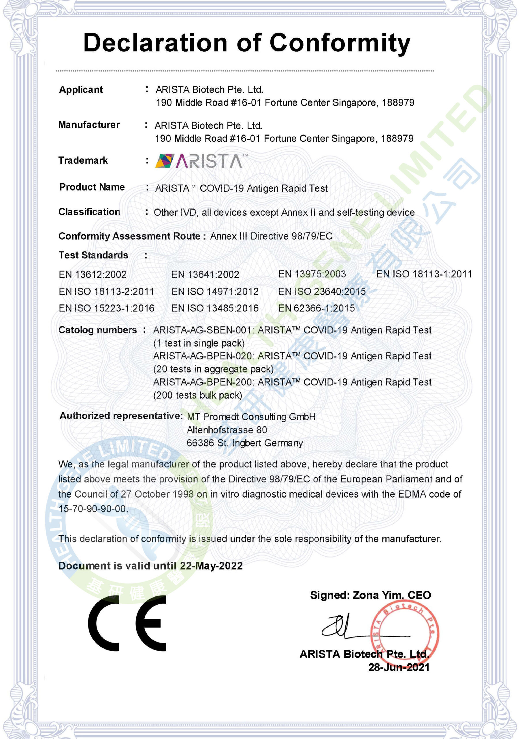 Singapore, 9th December 2021 – ARISTA Biotech Pte Ltd (“ARISTA”), manufacturer of COVID-19 antigen & antibody diagnostics, confirms that its COVID-19 antigen rapid test, which tests for the presence of SARS-CoV-2 virus in clinical specimens, is able to detect the recently identified B.1.1.529 (Omicron) variant.