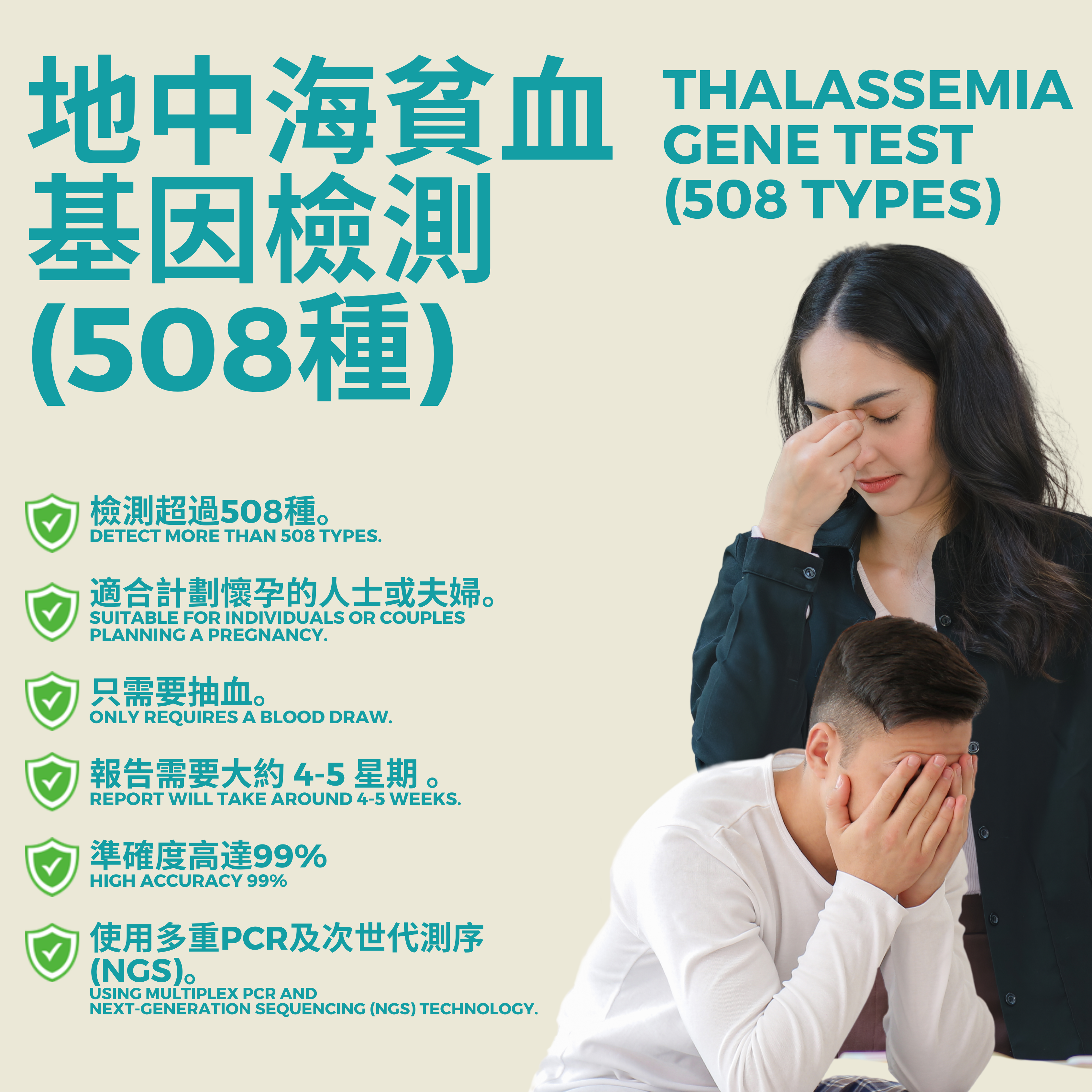 | 地中海貧血基因檢測 | 508 種基因變異株(包括α型和β型地中海貧血) |