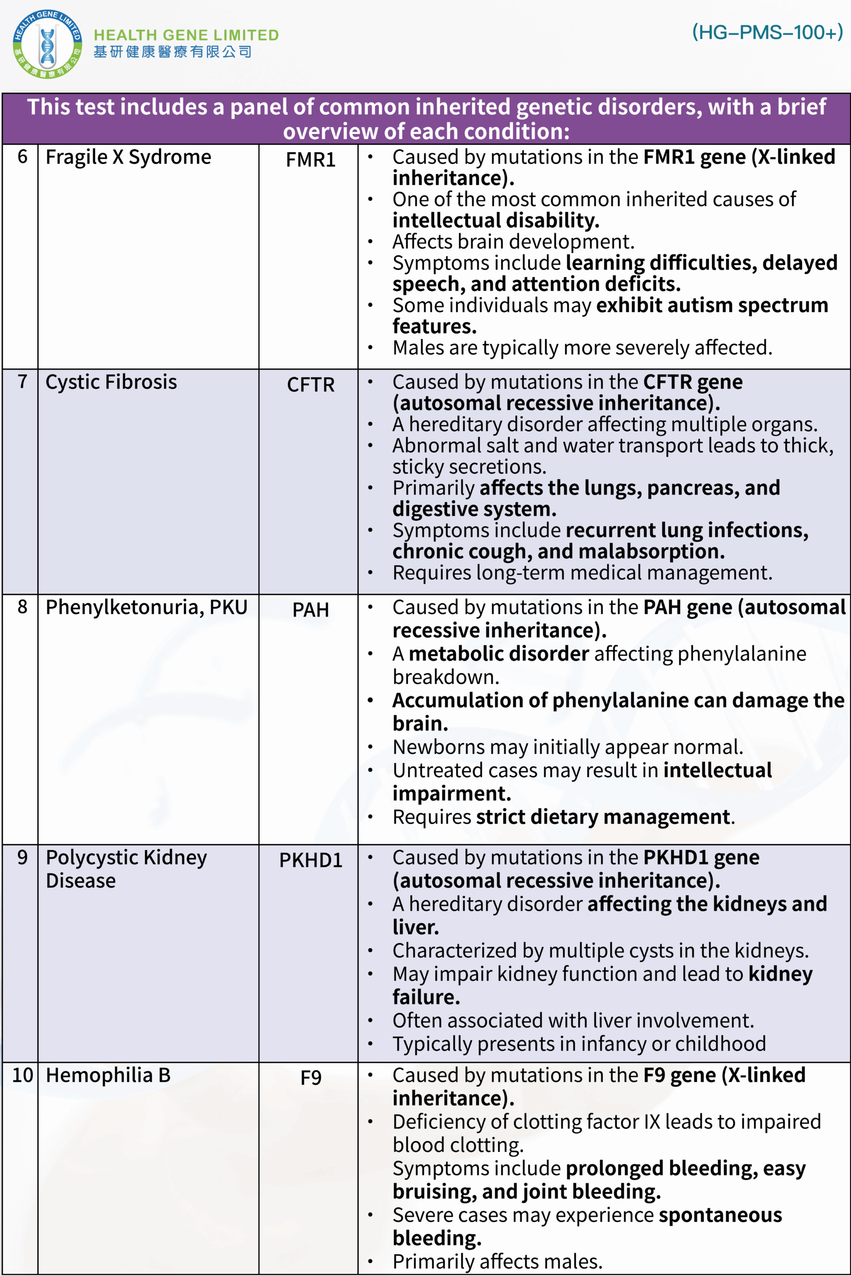 | 單基因遺傳病檢查 (170多種) | 詳情請參閱列在描述的名單。 |